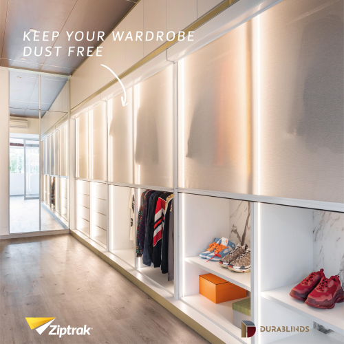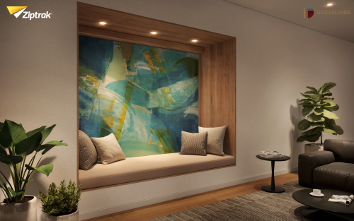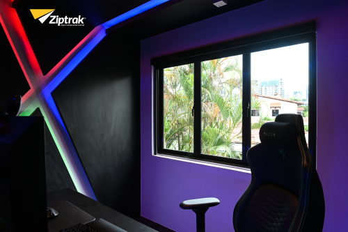 Inside the home, Ziptrak® opens up even more possibilities. Imagine a complete blockout blind for a gaming room, creating the perfect atmosphere with zero glare. Or a blind acting as a stylish barrier for a home bar—backlit to showcase bottles, with gold-wrapped hardware adding a luxurious touch. Ziptrak® has also been used as a clever solution for wardrobes, protecting valuables behind a see-through blind that doesn’t require the space of traditional doors. And for those wanting a design statement, blinds can even be printed to resemble artwork, with wrapped hardware blending seamlessly into surrounding walls.